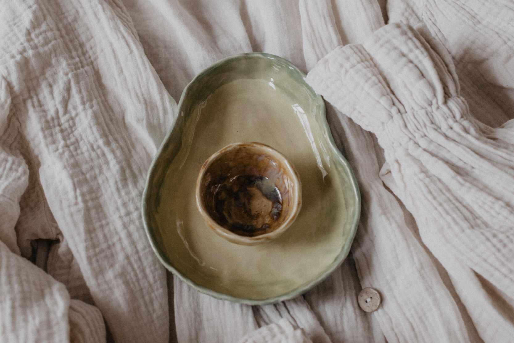 На занятии вы лепите форму, приделываете косточку-соусницу и придаете текстуру наружной поверхности. Ну а мы покрываем мисочку глазурью - несколькими цветами, чтобы было максимально "авокадисто" или любой другой на ваш выбор, и отдаём вам в течение двух недель.