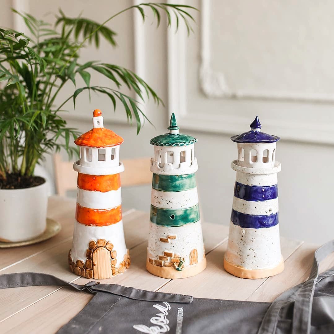 Маяк делается достаточно долго, но эти три часа пролетают как один миг! Вначале мы раскатываем глину в большой пласт, и делаем корпус. Далее - поставка под верхнюю башню и маленький забор. После этого - фигурная решетка верхней части. Это могут быть прямые окошки или фигурные - у каждого получится по-своему. Далее делаем крышу, все соединяем и только после этого приступаем к декору. Нарисовать двери и вырезать окошки, украсить маяк ступеньками, кирпичиками, ставнями, якорями - каждый подсвечник получается необыкновенно красивым!